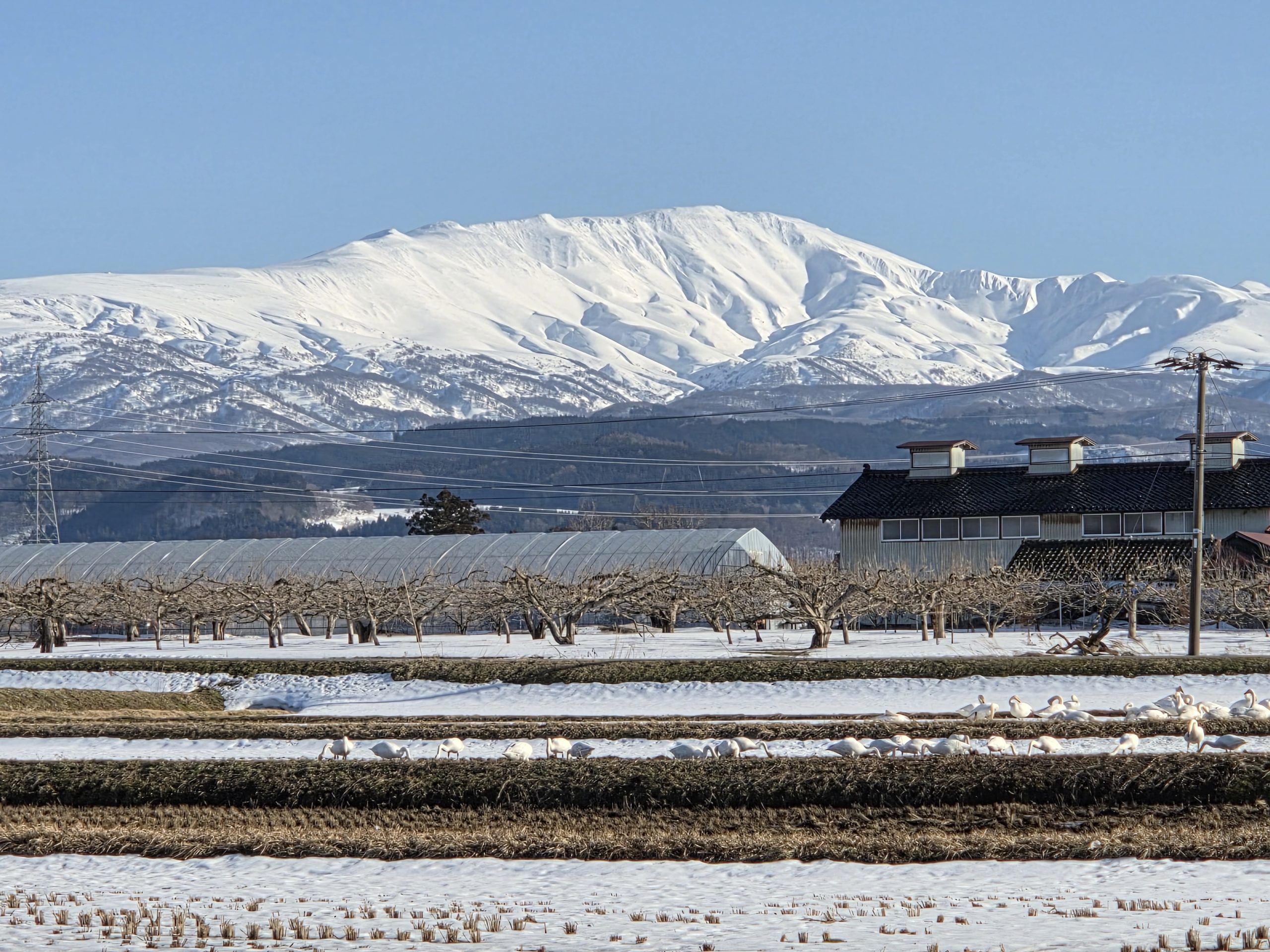 そんな日に、真っ白な雪を冠した月山を背景に白鳥が羽を休めていました🦢